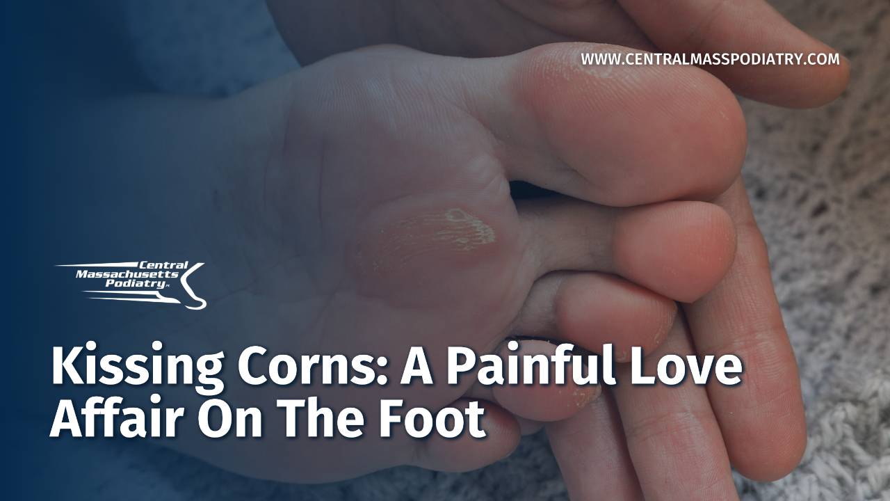 “Kissing corns” are calluses or corns that develop between the toes, usually between the fourth and fifth (pinky) digits. The pain happens because the toe bones rub against each other creating little corns that “kiss.” They are also called soft corns or calluses.